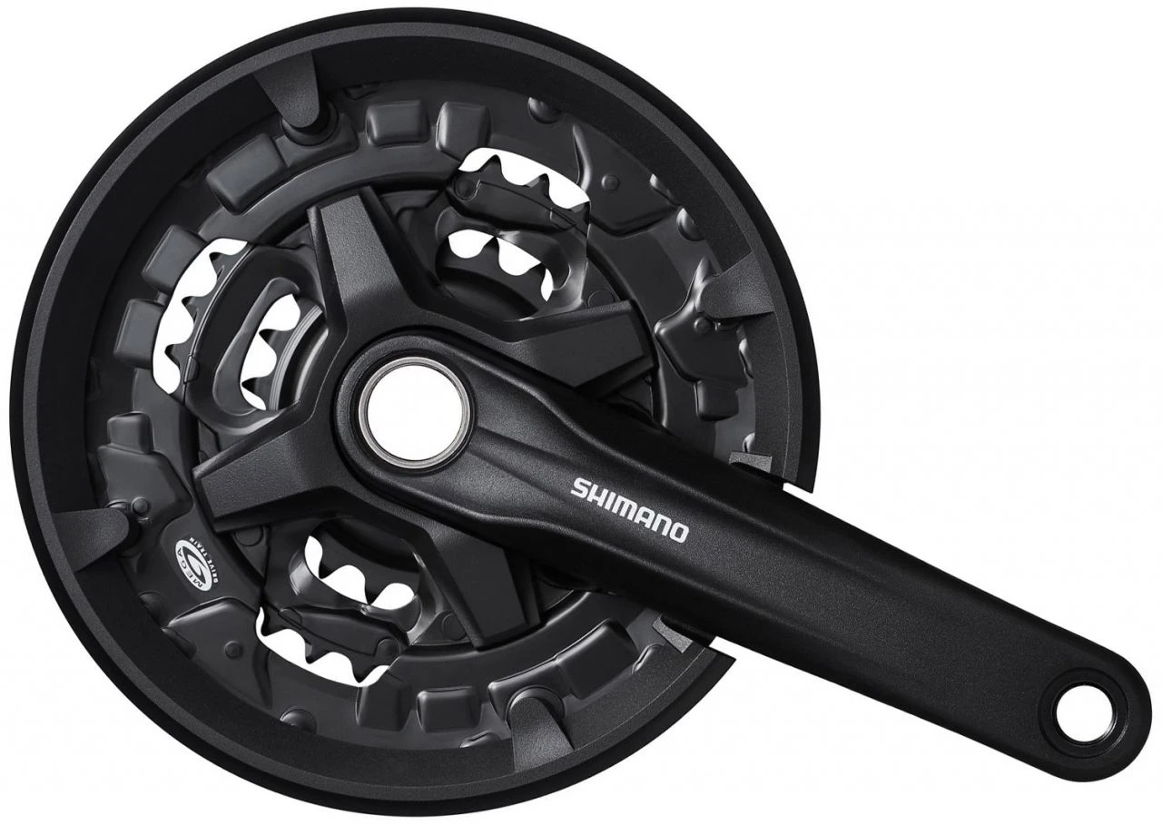 La biela Shimano FC-MT210 de 3×9 velocidades con anillo protector de cadena ofrece la máxima eficiencia de accionamiento y garantiza un ritmo óptimo.