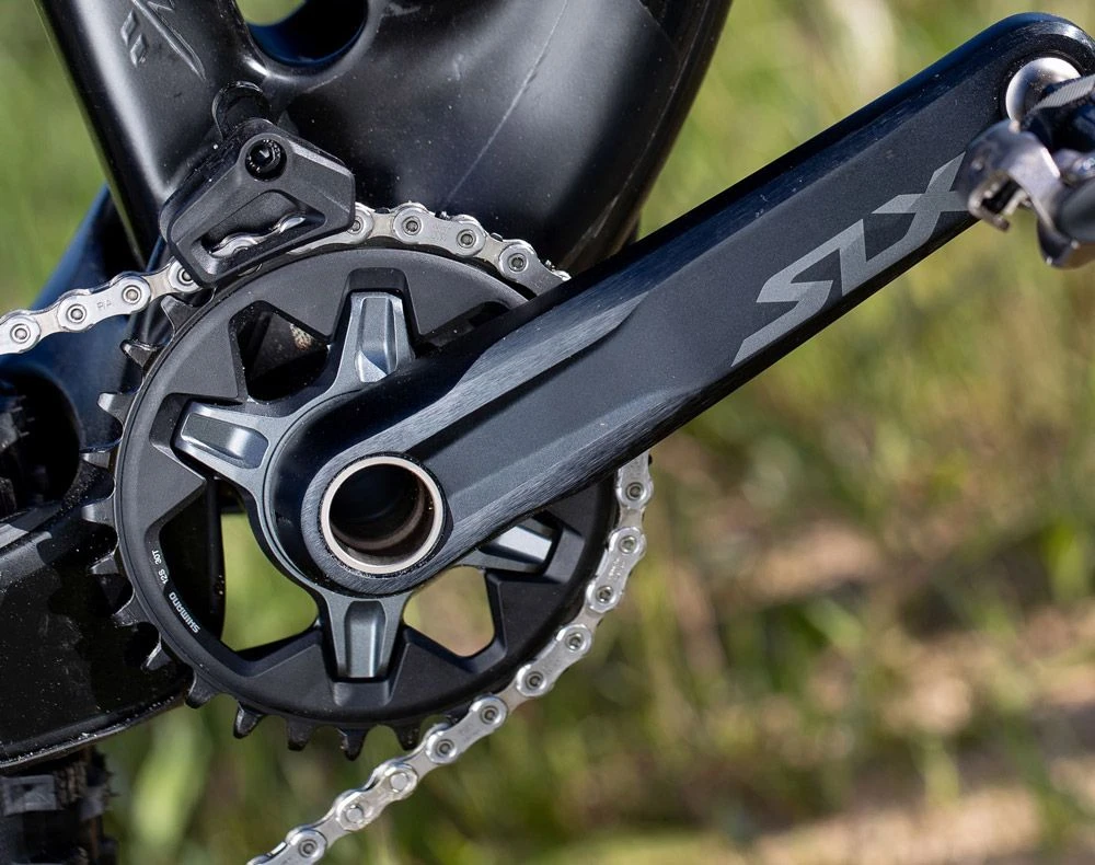 Las nuevas bielas SLX de 1×12 velocidades se caracterizan por la tecnología DYNAMIC CHAIN ENGAGEMENT+, cuyo perfil especial de dientes de alta precisión garantiza que la cadena encuentre un agarre óptimo en la parte superior del plato en terrenos difíciles, pero que se desprenda igualmente bien del plato en la parte inferior, garantizando así la eficiencia, la suavidad y el bajo nivel de ruido de la transmisión. Las bielas están equipadas con un sistema de montaje directo para un montaje rápido y seguro de los platos, lo que permite cambiar los platos en un abrir y cerrar de ojos. Las bielas están disponibles en especificaciones boost y no boost.
