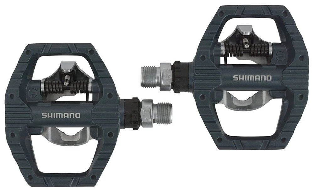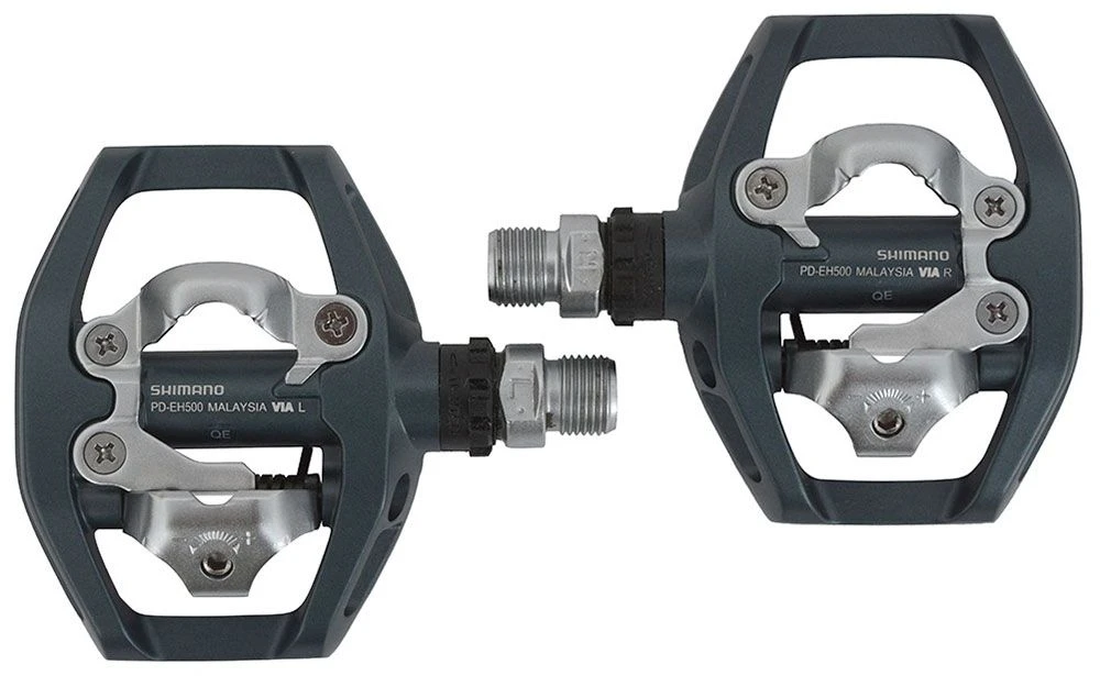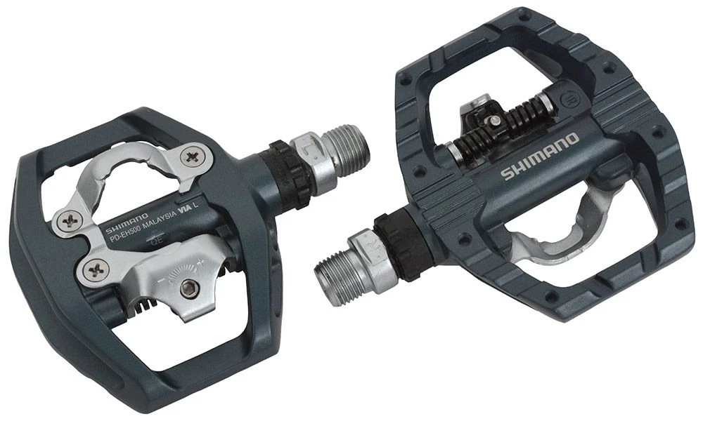 El pedal combinado Shimano PD-EH500 SPD destaca por su estética sencilla, su alta funcionalidad y su amplio rango de uso. Gracias al lado perfilado de la plataforma, a los pasadores incluidos e intercambiables y al probado sistema de clic SPD, los pedales Shimano pueden utilizarse tanto en carretera como fuera de ella.